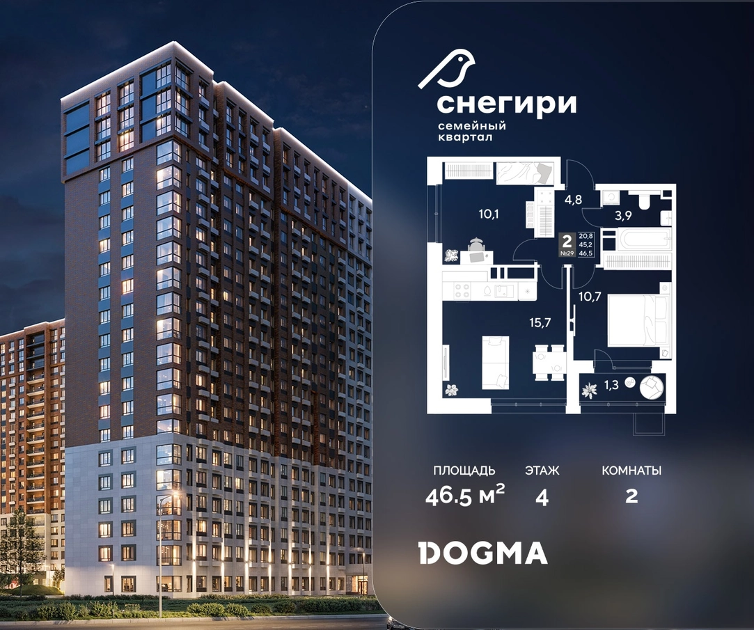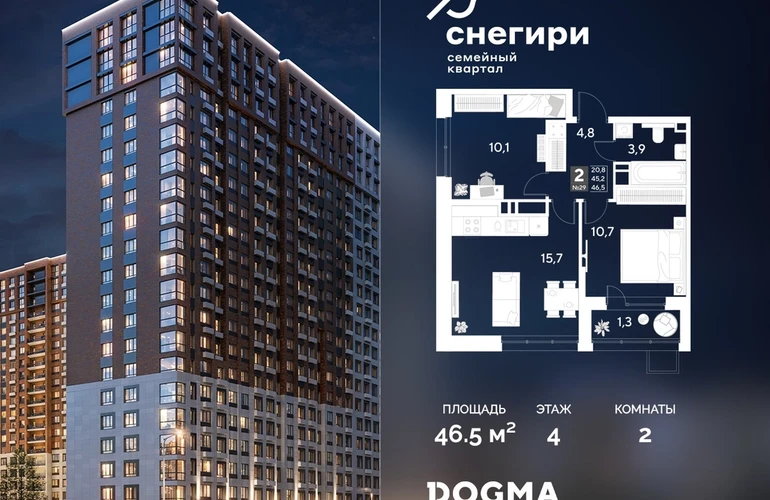 В продаже 2-комнатная квартира от застройщика DOGMA! ЖК «Снегири», г. Омск, Литер 1 Срок сдачи: (4 кв. 2027, общей площадью 46.5 кв.м., на 4 этаже.) Район для счастливой жизни«Снегири» — это семейный квартал, который дарит радость простых вещей: тепло дома, безопасность и живую природу рядом.
