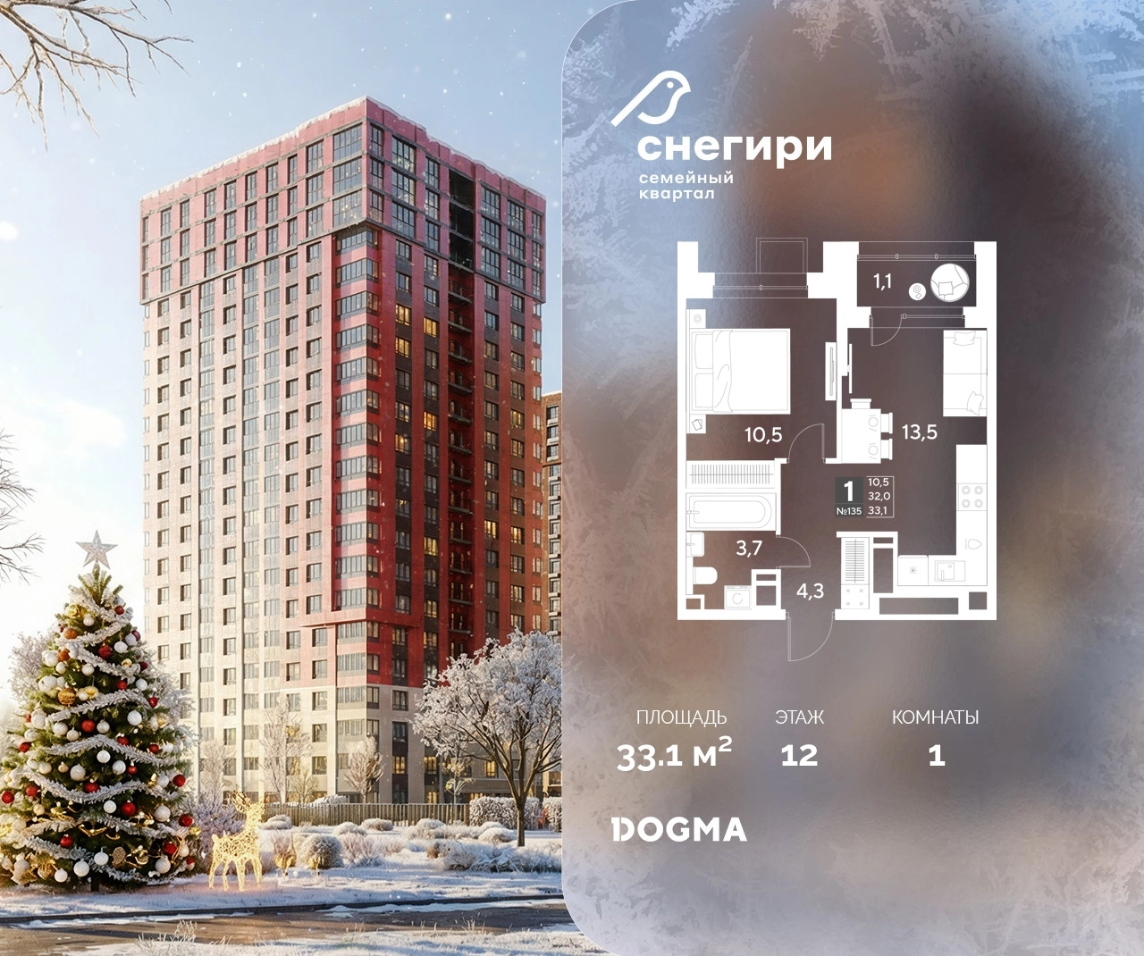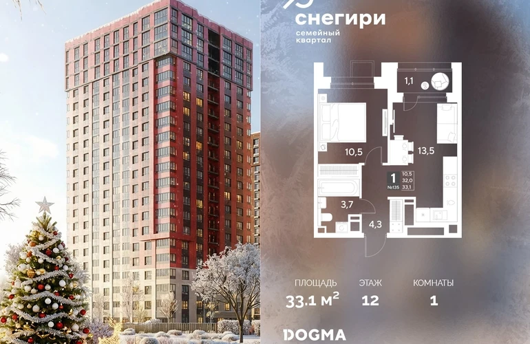 В продаже 1-комнатная квартира от застройщика DOGMA! ЖК «Снегири», г. Омск, Литер 1 Срок сдачи: (4 кв. 2027, общей площадью 33.1 кв.м., на 12 этаже.) Район для счастливой жизни«Снегири» — это семейный квартал, который дарит радость простых вещей: тепло дома, безопасность и живую природу рядом.