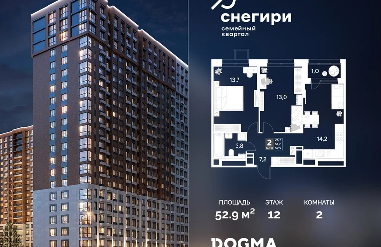 В продаже 2-комнатная квартира от застройщика DOGMA! ЖК «Снегири», г. Омск, Литер 1 Срок сдачи: (4 кв. 2027, общей площадью 52.9 кв.м., на 12 этаже.) Район для счастливой жизни«Снегири» — это семейный квартал, который дарит радость простых вещей: тепло дома, безопасность и живую природу рядом.