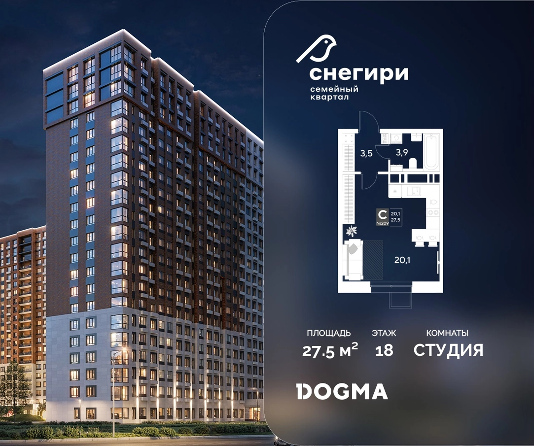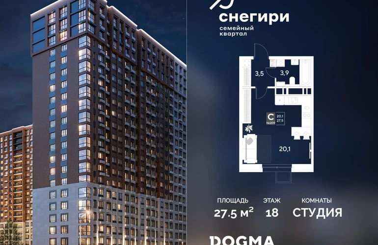 В продаже Студия от застройщика DOGMA! ЖК «Снегири», г. Омск, Литер 1 Срок сдачи: (4 кв. 2027, общей площадью 27.5 кв.м., на 18 этаже.) Район для счастливой жизни«Снегири» — это семейный квартал, который дарит радость простых вещей: тепло дома, безопасность и живую природу рядом.