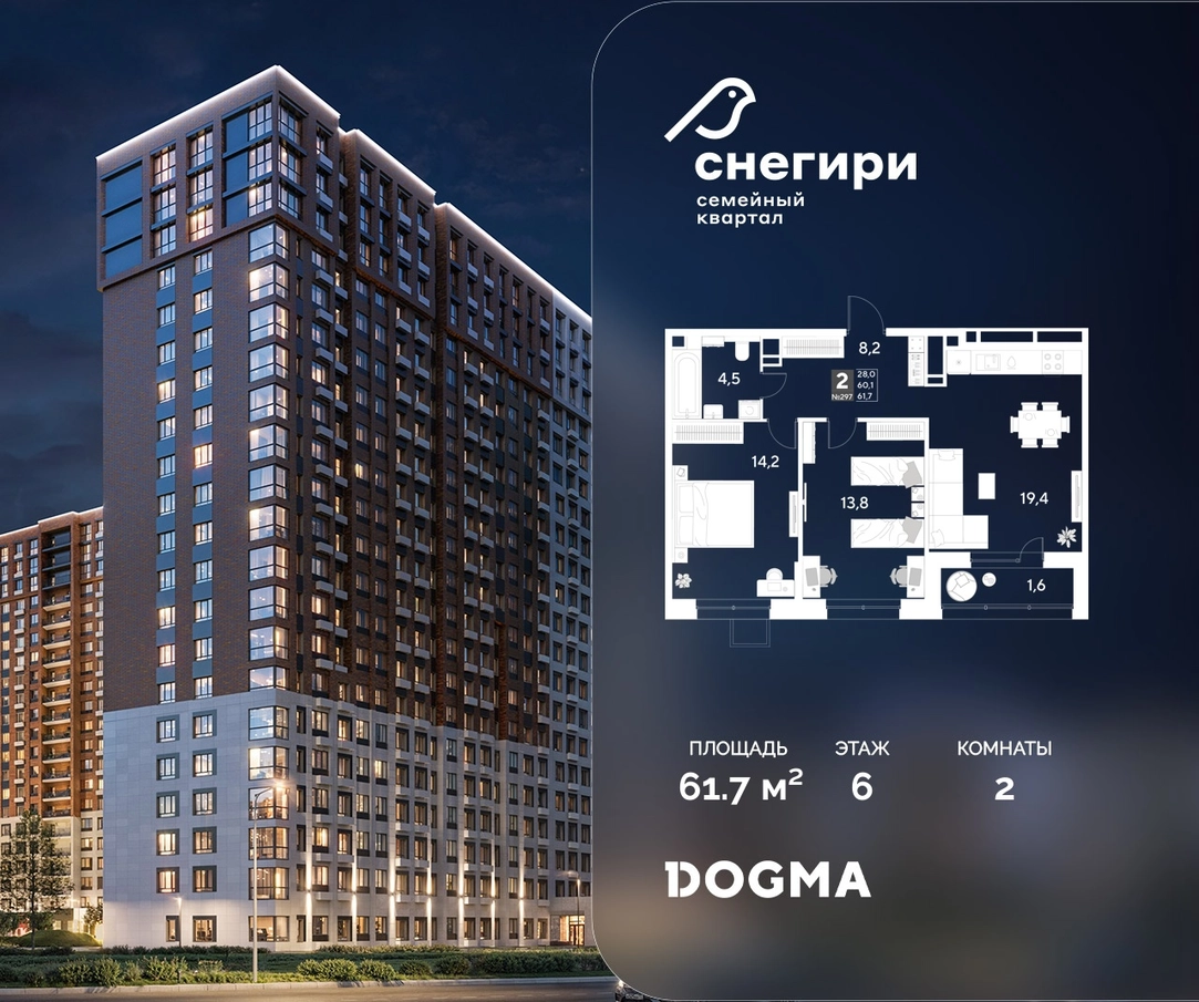 В продаже 2-комнатная квартира от застройщика DOGMA! ЖК «Снегири», г. Омск, Литер 1 Срок сдачи: (4 кв. 2027, общей площадью 61.7 кв.м., на 6 этаже.) Район для счастливой жизни«Снегири» — это семейный квартал, который дарит радость простых вещей: тепло дома, безопасность и живую природу рядом.