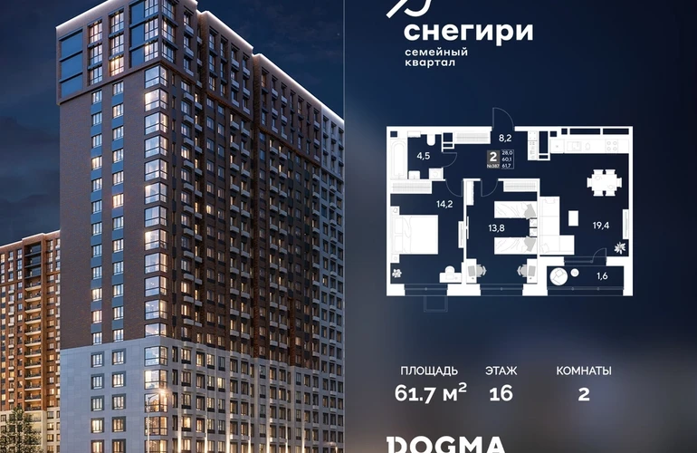 В продаже 2-комнатная квартира от застройщика DOGMA! ЖК «Снегири», г. Омск, Литер 1 Срок сдачи: (4 кв. 2027, общей площадью 61.7 кв.м., на 16 этаже.) Район для счастливой жизни«Снегири» — это семейный квартал, который дарит радость простых вещей: тепло дома, безопасность и живую природу рядом.