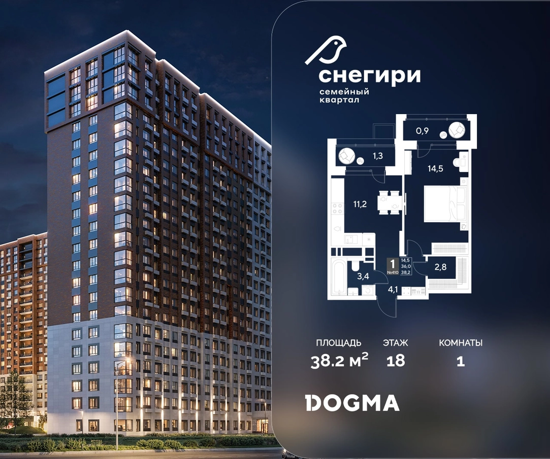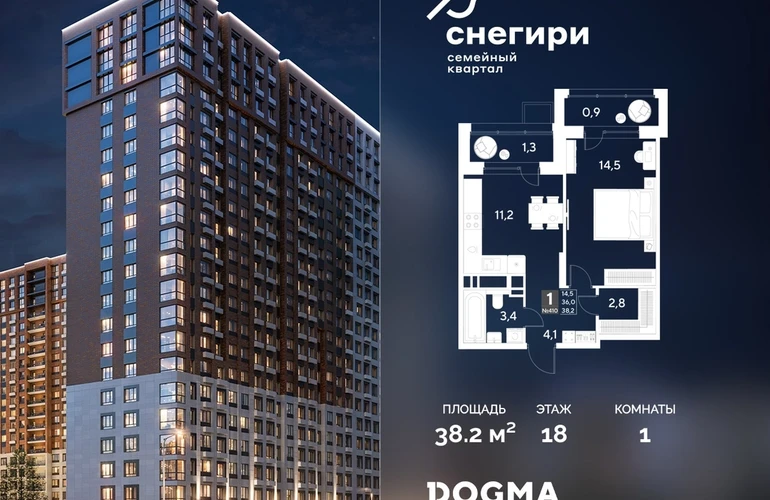 В продаже 1-комнатная квартира от застройщика DOGMA! ЖК «Снегири», г. Омск, Литер 1 Срок сдачи: (4 кв. 2027, общей площадью 38.2 кв.м., на 18 этаже.) Район для счастливой жизни«Снегири» — это семейный квартал, который дарит радость простых вещей: тепло дома, безопасность и живую природу рядом.