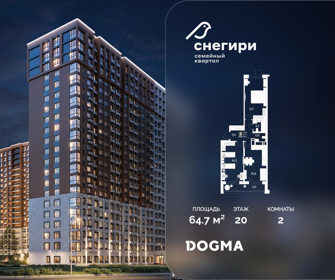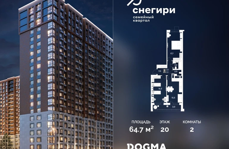 В продаже 2-комнатная квартира от застройщика DOGMA! ЖК «Снегири», г. Омск, Литер 1 Срок сдачи: (4 кв. 2027, общей площадью 64.7 кв.м., на 20 этаже.) Район для счастливой жизни«Снегири» — это семейный квартал, который дарит радость простых вещей: тепло дома, безопасность и живую природу рядом.