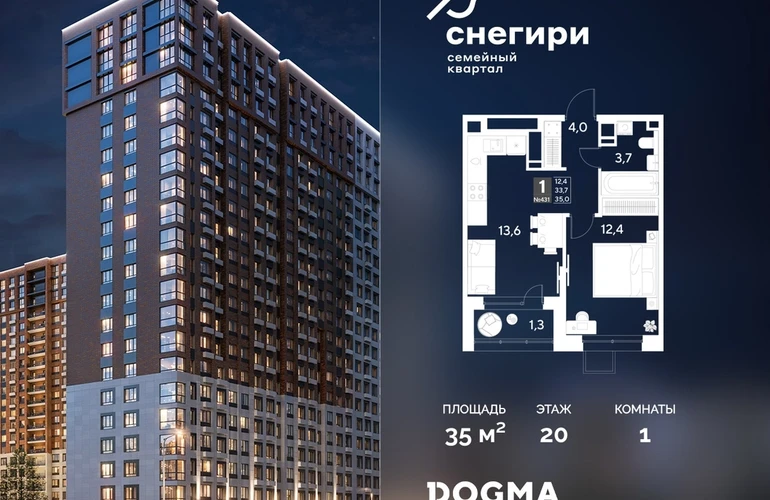 В продаже 1-комнатная квартира от застройщика DOGMA! ЖК «Снегири», г. Омск, Литер 1 Срок сдачи: (4 кв. 2027, общей площадью 35 кв.м., на 20 этаже.) Район для счастливой жизни«Снегири» — это семейный квартал, который дарит радость простых вещей: тепло дома, безопасность и живую природу рядом.