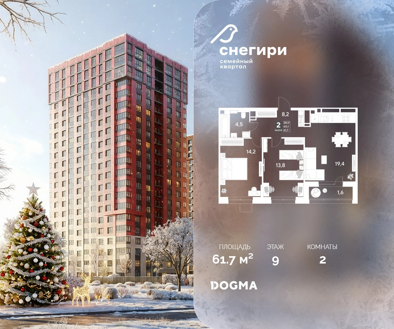 В продаже 2-комнатная квартира от застройщика DOGMA! ЖК «Снегири», г. Омск, Литер 1 Срок сдачи: (4 кв. 2027, общей площадью 61.7 кв.м., на 9 этаже.) Район для счастливой жизни«Снегири» — это семейный квартал, который дарит радость простых вещей: тепло дома, безопасность и живую природу рядом.
