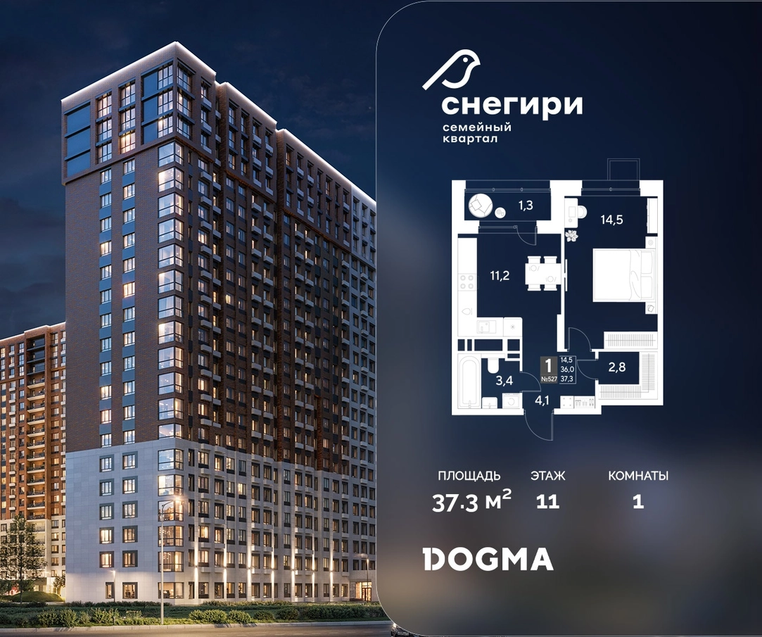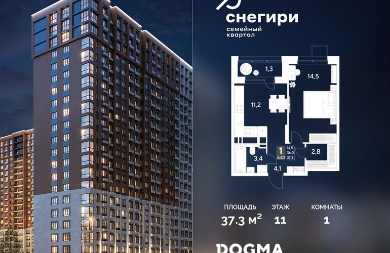 В продаже 1-комнатная квартира от застройщика DOGMA! ЖК «Снегири», г. Омск, Литер 1 Срок сдачи: (4 кв. 2027, общей площадью 37.3 кв.м., на 11 этаже.) Район для счастливой жизни«Снегири» — это семейный квартал, который дарит радость простых вещей: тепло дома, безопасность и живую природу рядом.