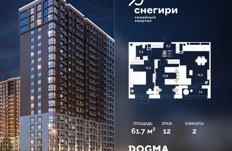В продаже 2-комнатная квартира от застройщика DOGMA! ЖК «Снегири», г. Омск, Литер 1 Срок сдачи: (4 кв. 2027, общей площадью 61.7 кв.м., на 12 этаже.) Район для счастливой жизни«Снегири» — это семейный квартал, который дарит радость простых вещей: тепло дома, безопасность и живую природу рядом.