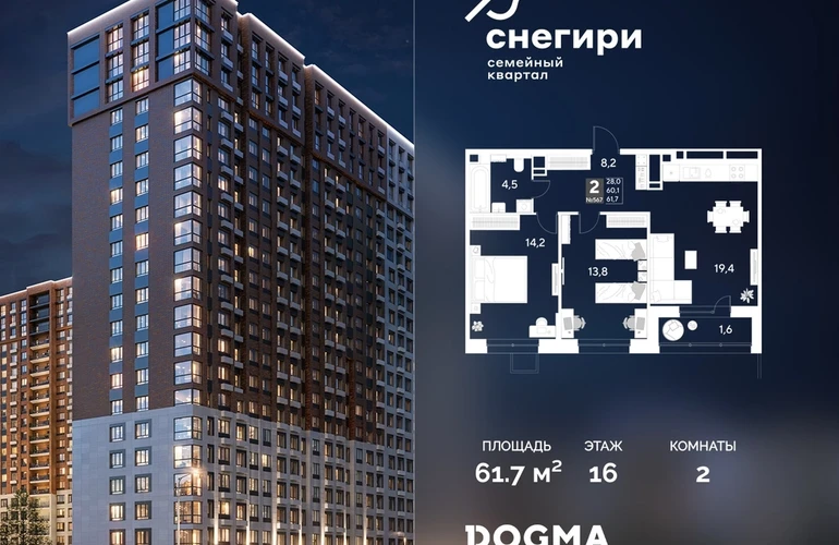 В продаже 2-комнатная квартира от застройщика DOGMA! ЖК «Снегири», г. Омск, Литер 1 Срок сдачи: (4 кв. 2027, общей площадью 61.7 кв.м., на 16 этаже.) Район для счастливой жизни«Снегири» — это семейный квартал, который дарит радость простых вещей: тепло дома, безопасность и живую природу рядом.