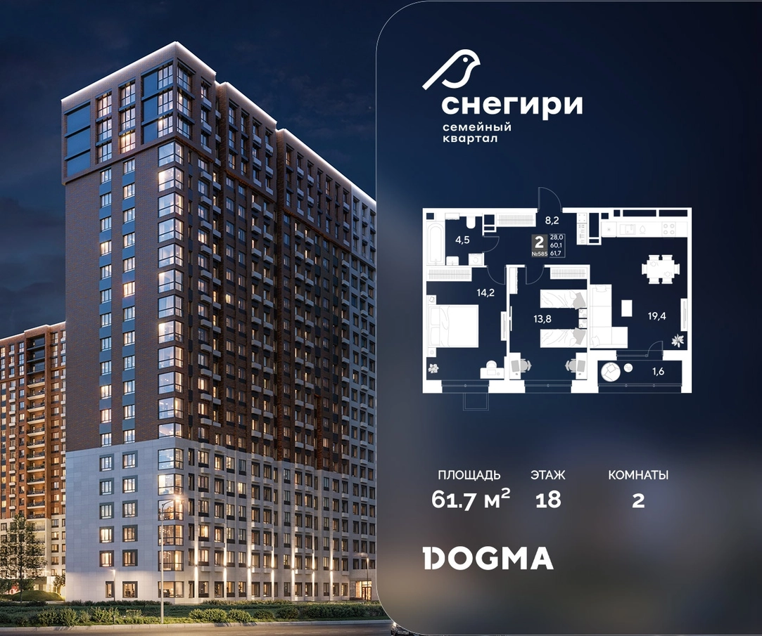 В продаже 2-комнатная квартира от застройщика DOGMA! ЖК «Снегири», г. Омск, Литер 1 Срок сдачи: (4 кв. 2027, общей площадью 61.7 кв.м., на 18 этаже.) Район для счастливой жизни«Снегири» — это семейный квартал, который дарит радость простых вещей: тепло дома, безопасность и живую природу рядом.