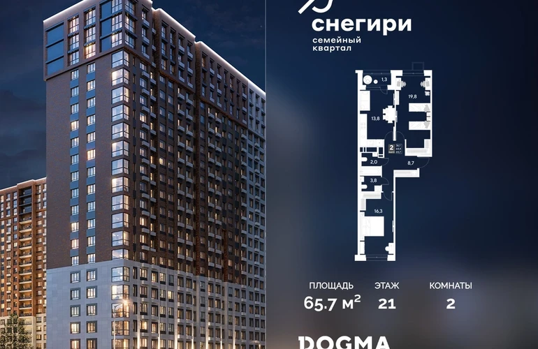 В продаже 2-комнатная квартира от застройщика DOGMA! ЖК «Снегири», г. Омск, Литер 1 Срок сдачи: (4 кв. 2027, общей площадью 65.7 кв.м., на 21 этаже.) Район для счастливой жизни«Снегири» — это семейный квартал, который дарит радость простых вещей: тепло дома, безопасность и живую природу рядом.