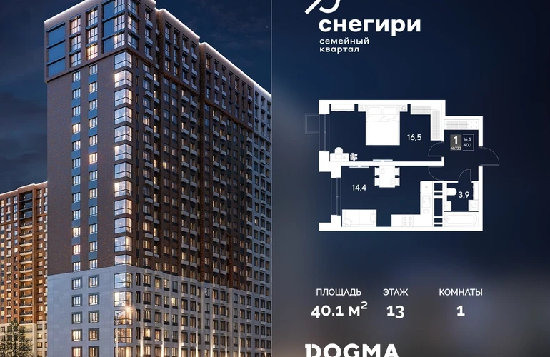 В продаже 1-комнатная квартира от застройщика DOGMA! ЖК «Снегири», г. Омск, Литер 1 Срок сдачи: (4 кв. 2027, общей площадью 40.1 кв.м., на 13 этаже.) Район для счастливой жизни«Снегири» — это семейный квартал, который дарит радость простых вещей: тепло дома, безопасность и живую природу рядом.