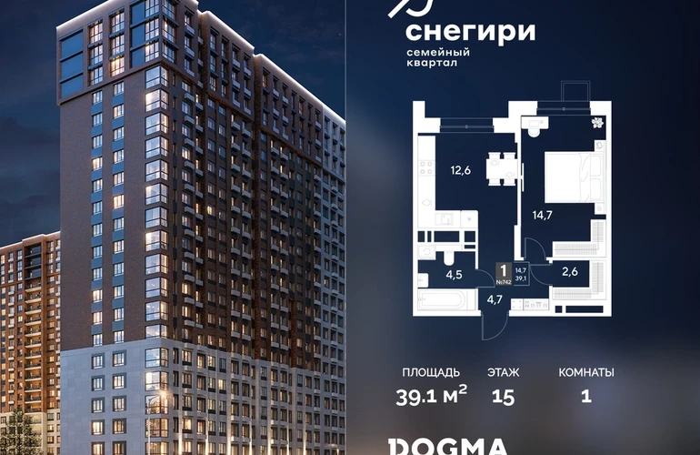 В продаже 1-комнатная квартира от застройщика DOGMA! ЖК «Снегири», г. Омск, Литер 1 Срок сдачи: (4 кв. 2027, общей площадью 39.1 кв.м., на 15 этаже.) Район для счастливой жизни«Снегири» — это семейный квартал, который дарит радость простых вещей: тепло дома, безопасность и живую природу рядом.