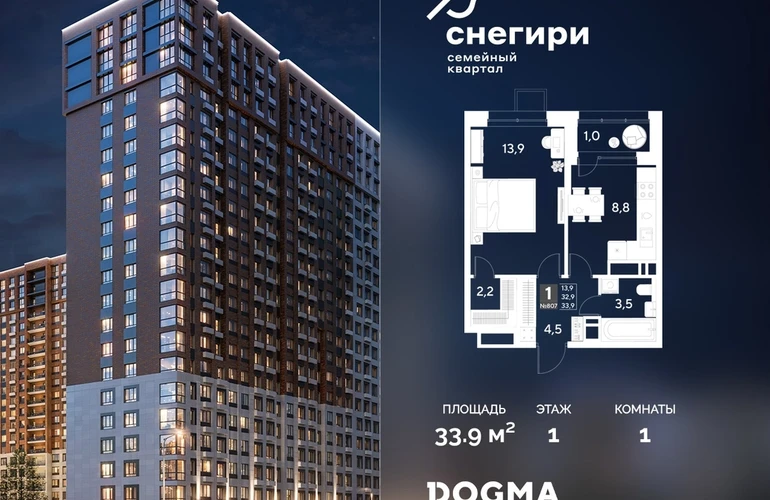В продаже 1-комнатная квартира от застройщика DOGMA! ЖК «Снегири», г. Омск, Литер 1 Срок сдачи: (4 кв. 2027, общей площадью 33.9 кв.м., на 1 этаже.) Район для счастливой жизни«Снегири» — это семейный квартал, который дарит радость простых вещей: тепло дома, безопасность и живую природу рядом.