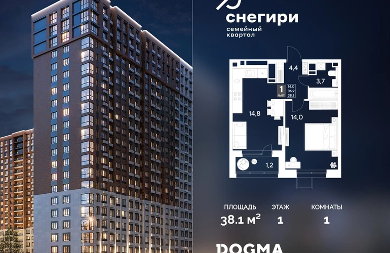 В продаже 1-комнатная квартира от застройщика DOGMA! ЖК «Снегири», г. Омск, Литер 1 Срок сдачи: (4 кв. 2027, общей площадью 38.1 кв.м., на 1 этаже.) Район для счастливой жизни«Снегири» — это семейный квартал, который дарит радость простых вещей: тепло дома, безопасность и живую природу рядом.