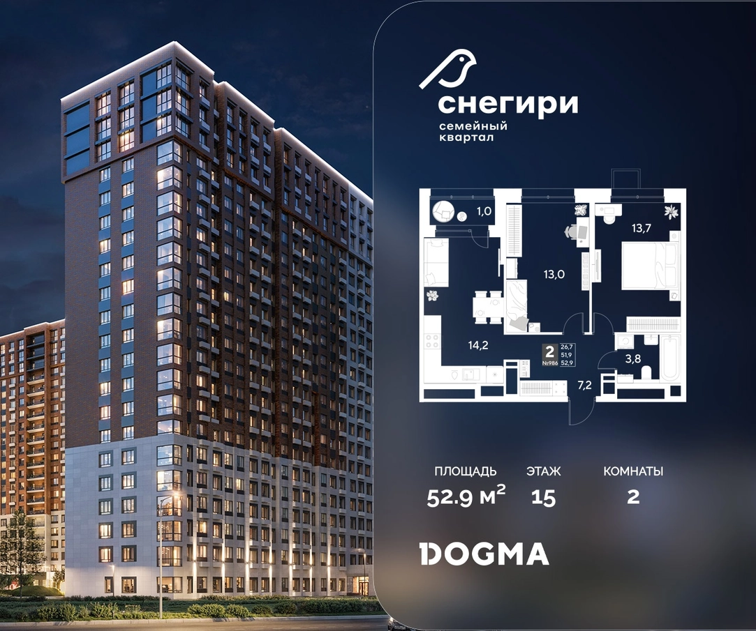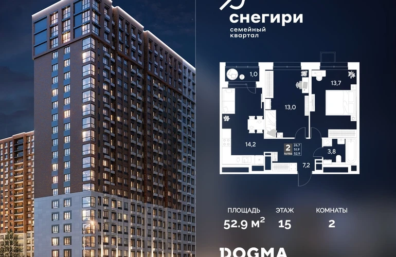 В продаже 2-комнатная квартира от застройщика DOGMA! ЖК «Снегири», г. Омск, Литер 1 Срок сдачи: (4 кв. 2027, общей площадью 52.9 кв.м., на 15 этаже.) Район для счастливой жизни«Снегири» — это семейный квартал, который дарит радость простых вещей: тепло дома, безопасность и живую природу рядом.