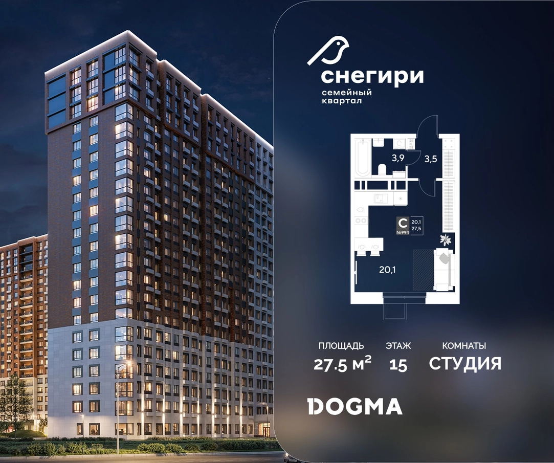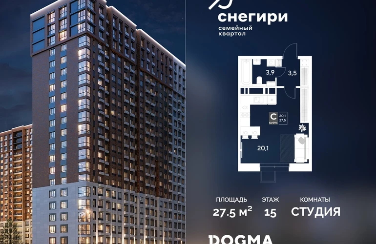 В продаже Студия от застройщика DOGMA! ЖК «Снегири», г. Омск, Литер 1 Срок сдачи: (4 кв. 2027, общей площадью 27.5 кв.м., на 15 этаже.) Район для счастливой жизни«Снегири» — это семейный квартал, который дарит радость простых вещей: тепло дома, безопасность и живую природу рядом.