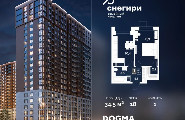 В продаже 1-комнатная квартира от застройщика DOGMA! ЖК «Снегири», г. Омск, Литер 1 Срок сдачи: (4 кв. 2027, общей площадью 34.5 кв.м., на 18 этаже.) Район для счастливой жизни«Снегири» — это семейный квартал, который дарит радость простых вещей: тепло дома, безопасность и живую природу рядом.
