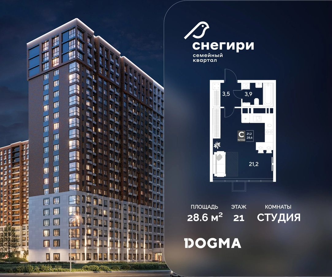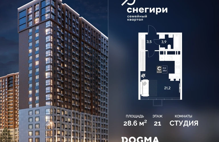 В продаже Студия от застройщика DOGMA! ЖК «Снегири», г. Омск, Литер 1 Срок сдачи: (4 кв. 2027, общей площадью 28.6 кв.м., на 21 этаже.) Район для счастливой жизни«Снегири» — это семейный квартал, который дарит радость простых вещей: тепло дома, безопасность и живую природу рядом.