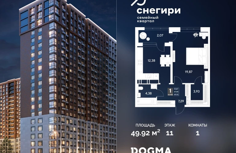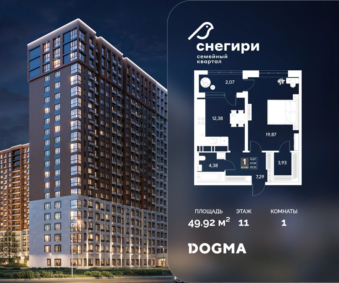 В продаже 1-комнатная квартира от застройщика DOGMA! ЖК «Снегири», г. Омск, Литер 2 Срок сдачи: (4 кв. 2027, общей площадью 49.92 кв.м., на 11 этаже.) Район для счастливой жизни«Снегири» — это семейный квартал, который дарит радость простых вещей: тепло дома, безопасность и живую природу рядом.