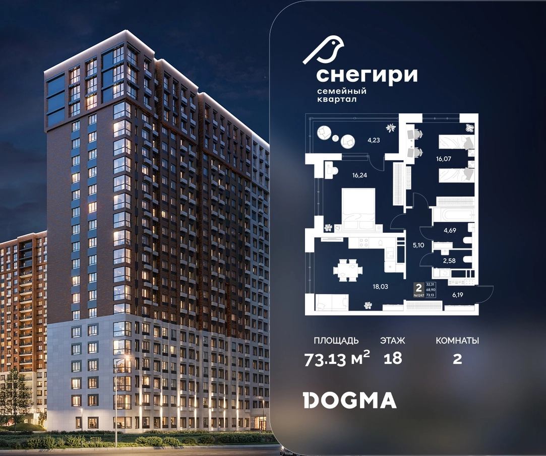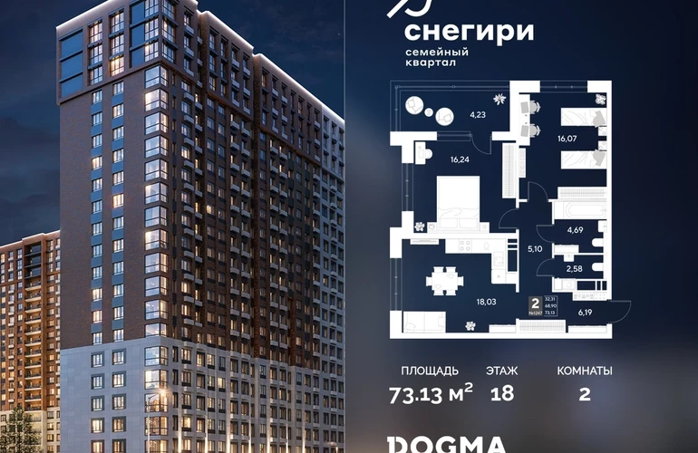 В продаже 2-комнатная квартира от застройщика DOGMA! ЖК «Снегири», г. Омск, Литер 2 Срок сдачи: (4 кв. 2027, общей площадью 73.13 кв.м., на 18 этаже.) Район для счастливой жизни«Снегири» — это семейный квартал, который дарит радость простых вещей: тепло дома, безопасность и живую природу рядом.