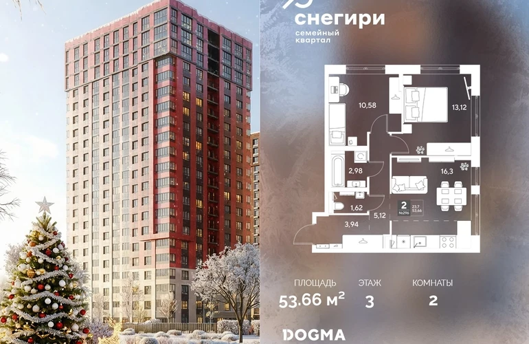 В продаже 2-комнатная квартира от застройщика DOGMA! ЖК «Снегири», г. Омск, Литер 3 Срок сдачи: (3 кв. 2029, общей площадью 53.66 кв.м., на 3 этаже.) Район для счастливой жизни«Снегири» — это семейный квартал, который дарит радость простых вещей: тепло дома, безопасность и живую природу рядом.