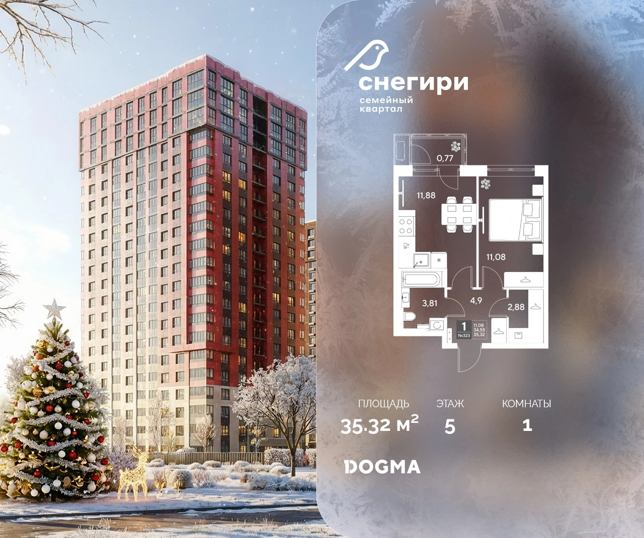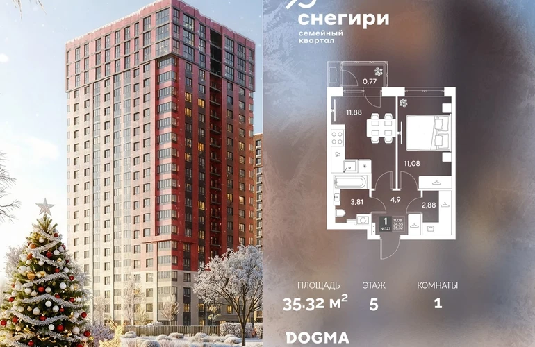 В продаже 1-комнатная квартира от застройщика DOGMA! ЖК «Снегири», г. Омск, Литер 3 Срок сдачи: (3 кв. 2029, общей площадью 35.32 кв.м., на 5 этаже.) Район для счастливой жизни«Снегири» — это семейный квартал, который дарит радость простых вещей: тепло дома, безопасность и живую природу рядом.