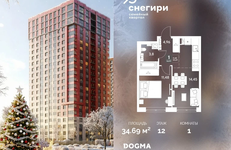 В продаже 1-комнатная квартира от застройщика DOGMA! ЖК «Снегири», г. Омск, Литер 3 Срок сдачи: (3 кв. 2029, общей площадью 34.69 кв.м., на 12 этаже.) Район для счастливой жизни«Снегири» — это семейный квартал, который дарит радость простых вещей: тепло дома, безопасность и живую природу рядом.