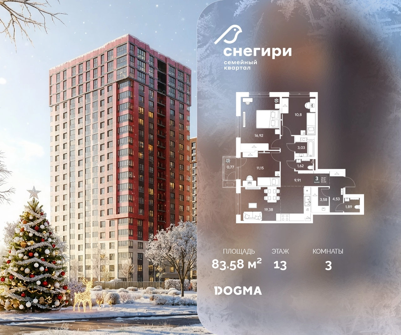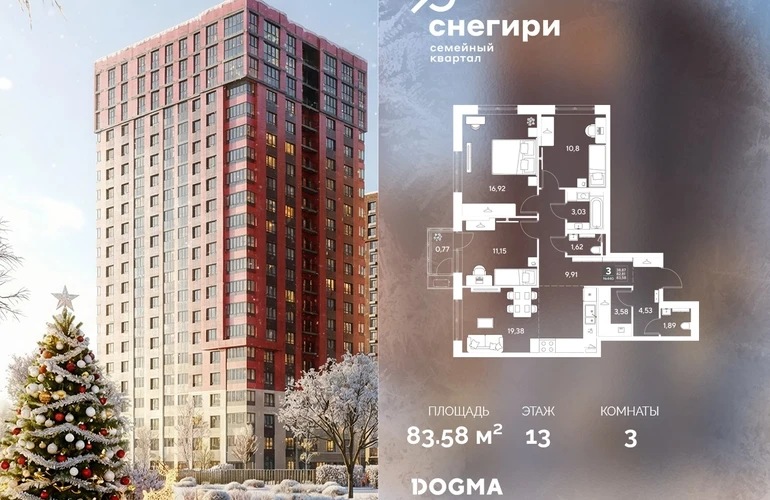 В продаже 3-комнатная квартира от застройщика DOGMA! ЖК «Снегири», г. Омск, Литер 3 Срок сдачи: (3 кв. 2029, общей площадью 83.58 кв.м., на 13 этаже.) Район для счастливой жизни«Снегири» — это семейный квартал, который дарит радость простых вещей: тепло дома, безопасность и живую природу рядом.