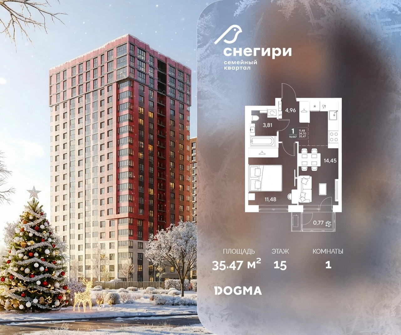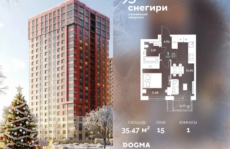 В продаже 1-комнатная квартира от застройщика DOGMA! ЖК «Снегири», г. Омск, Литер 3 Срок сдачи: (3 кв. 2029, общей площадью 35.47 кв.м., на 15 этаже.) Район для счастливой жизни«Снегири» — это семейный квартал, который дарит радость простых вещей: тепло дома, безопасность и живую природу рядом.